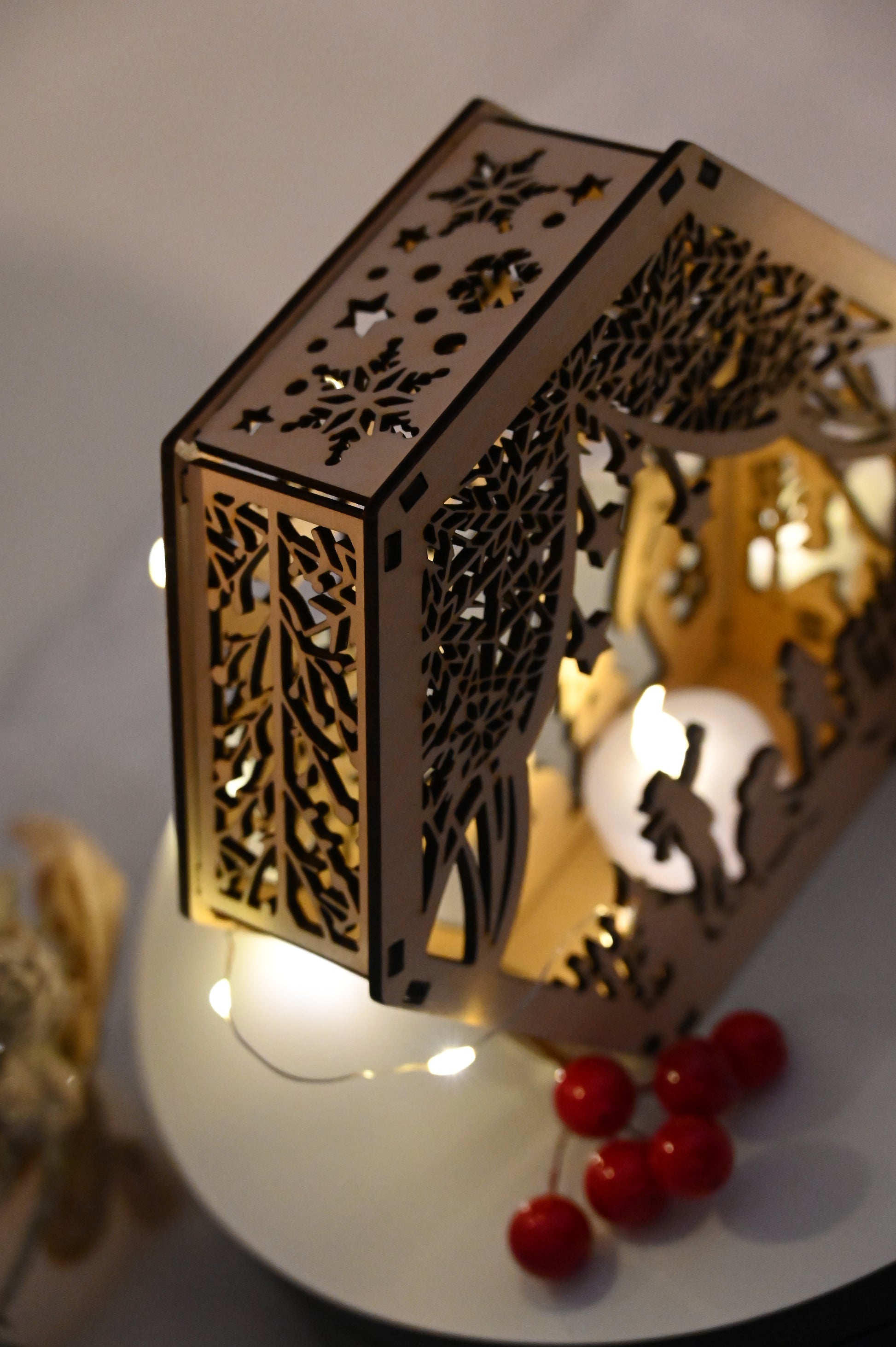 This handcrafted wooden shadow box doubles as a candle holder. This piece is the perfect way to add a cosy, festive glow to your Christmas nights.